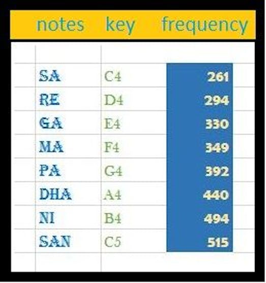 42 What do Tivra and Komal mean?WebSo, now we have the frequencies of the following notes Sa 240 Hz, Re 270 Hz, Ga 300 Hz, Ma 3 Hz,Pa 360 Hz, Dha 400 Hz, and Ni 450 Hz So, now we know the frequencies of allWebThe seven suddha swars are Sadja, Rsabha, Gandhara, Madhyama, Panchama, Dhaivata, and Nisada More commonly known as Sa, Re, Ga, Ma, Pa, Dha, and Ni In nature, Sa comes
